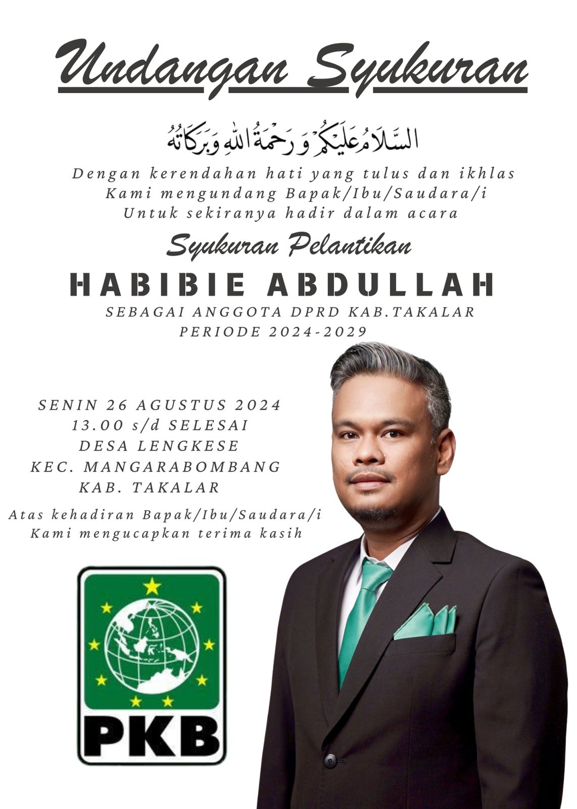 Sekilas Indonesia, Takalar – Masyarakat Kecamatan Mangarabombang-Polsel-Laikang (Dapil 2 Takalar) dan seluruh pejuang Habibie Abdullah diundang untuk hadir dalam acara syukuran atas pelantikan Habibie Abdullah sebagai Anggota Dewan Perwakilan Rakyat Daerah (DPRD) Kabupaten Takalar untuk periode 2024-2029.