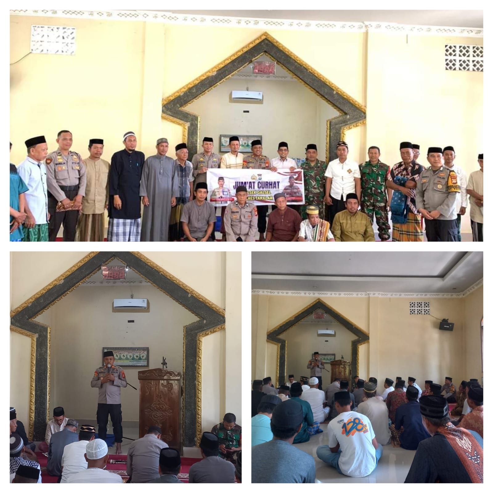 Kapolsek Galesong Selatan menggelar kegiatan Jumat Curhat di Masjid At-Taubah, Dusun Cambaya, Desa Bontokassi, Kecamatan Galesong Selatan, Kabupaten Takalar, pada Jumat, 22 Agustus 2024.