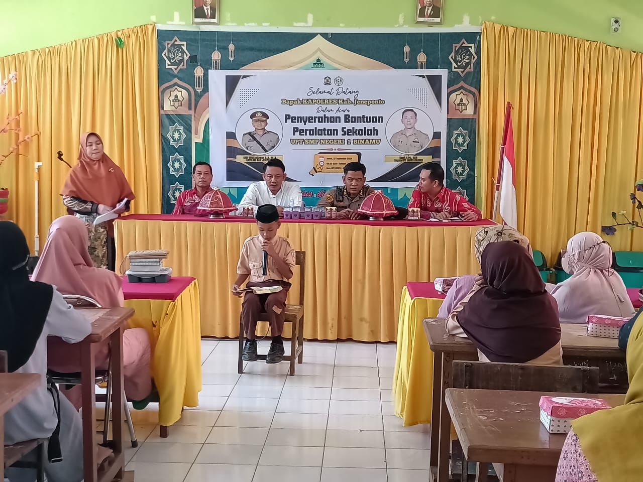 SEKILAS INDONESIA, JENEPONTO – Kapolres Jeneponto, AKBP Widi Setiawan, S.I.K., M.I.K, memberikan bantuan peralatan sekolah kepada SMP Negeri 1 Binamu, Kabupaten Jeneponto, 27/09/2024.