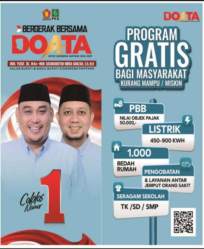 SEKILAS INDONESIA, SIDRAP, Jum’at, 01 November 2024 – Pasangan calon Bupati dan Wakil Bupati Sidrap nomor urut 01, Muhammad Yusuf, SH, M.Kn, dan Muhammad Datariansyah, SH, MH, membawa semangat baru untuk periode 2024-2029. Mengusung tagline “Bergerak Bersama DOA’TA,” pasangan yang diusung oleh Partai Gerindra dan PKB ini berkomitmen menciptakan program-program pro-rakyat demi kesejahteraan warga Sidrap.