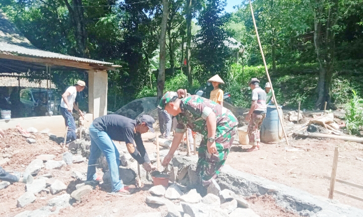 “Dimana Babinsa Desa Batukuda yang mendapatkan tugas dari Danramil Mancak mengatakan dalam melaksanakan giat Karbak membantu pembangunan rumah bersama warga bertempat di Kampung Sambilandak,” ujar Babinsa Serma Aep Mulyana.