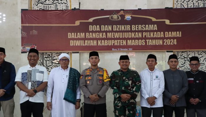 Sekilas Indonesia, Maros, Sulsel- Menjelang pelaksanaan Pemilihan Kepala Daerah (Pilkada) serentak yang akan digelar pada 27 November 2024 mendatang, Polres Maros Polda Sulawesi Selatan (Sulsel) menggelar Dzikir dan Doa Bersama untuk menciptakan suasana yang aman dan kondusif.