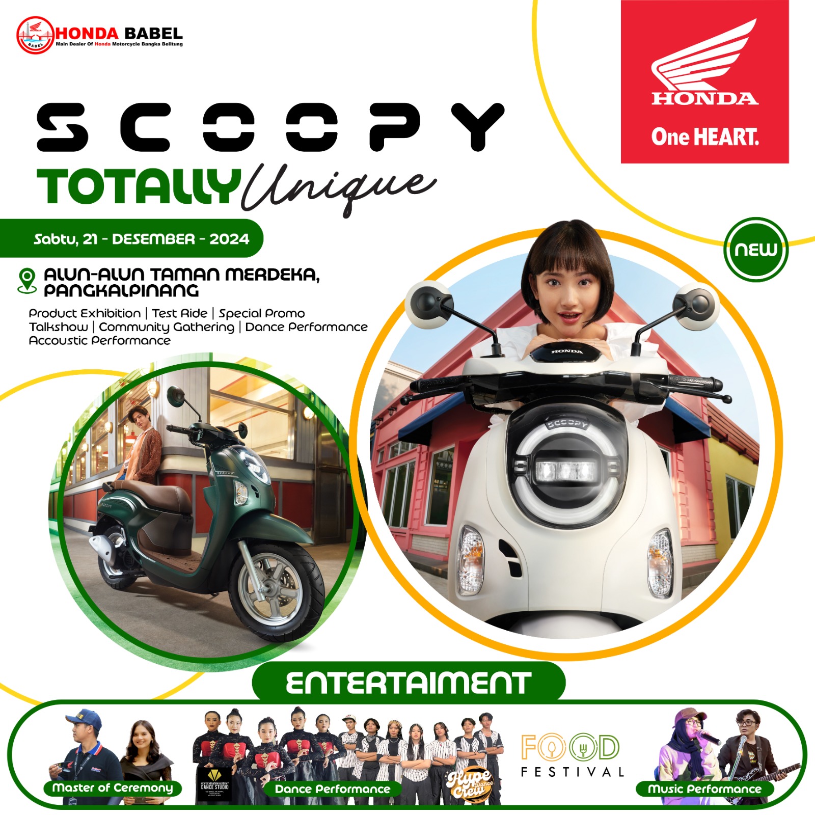 Bertajuk “Totally Unique” New Honda Scoopy hadir dengan berbagai perubahan signifikan dari sisi desain dan fitur modern serta konsepnya dapat mencuri perhatian pecinta skutik di Indonesia khususnya di Bangka Belitung.