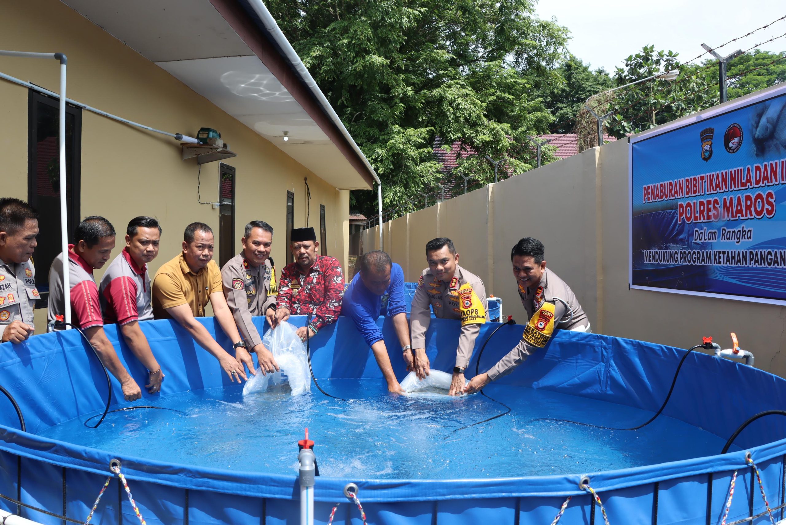 Sebanyak 5.000 ekor bibit ikan lele dan 1,000 ekor ikan nila ditebar dikolam Bioflok buatan milik Satres Narkoba Polres Maros yang terletak di samping gedung Sat Narkoba Polres Maros.