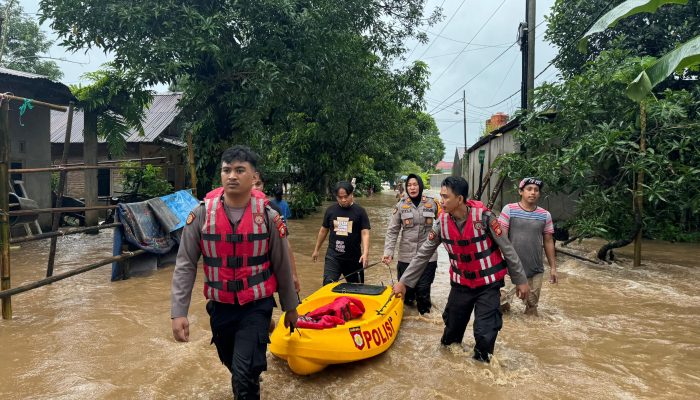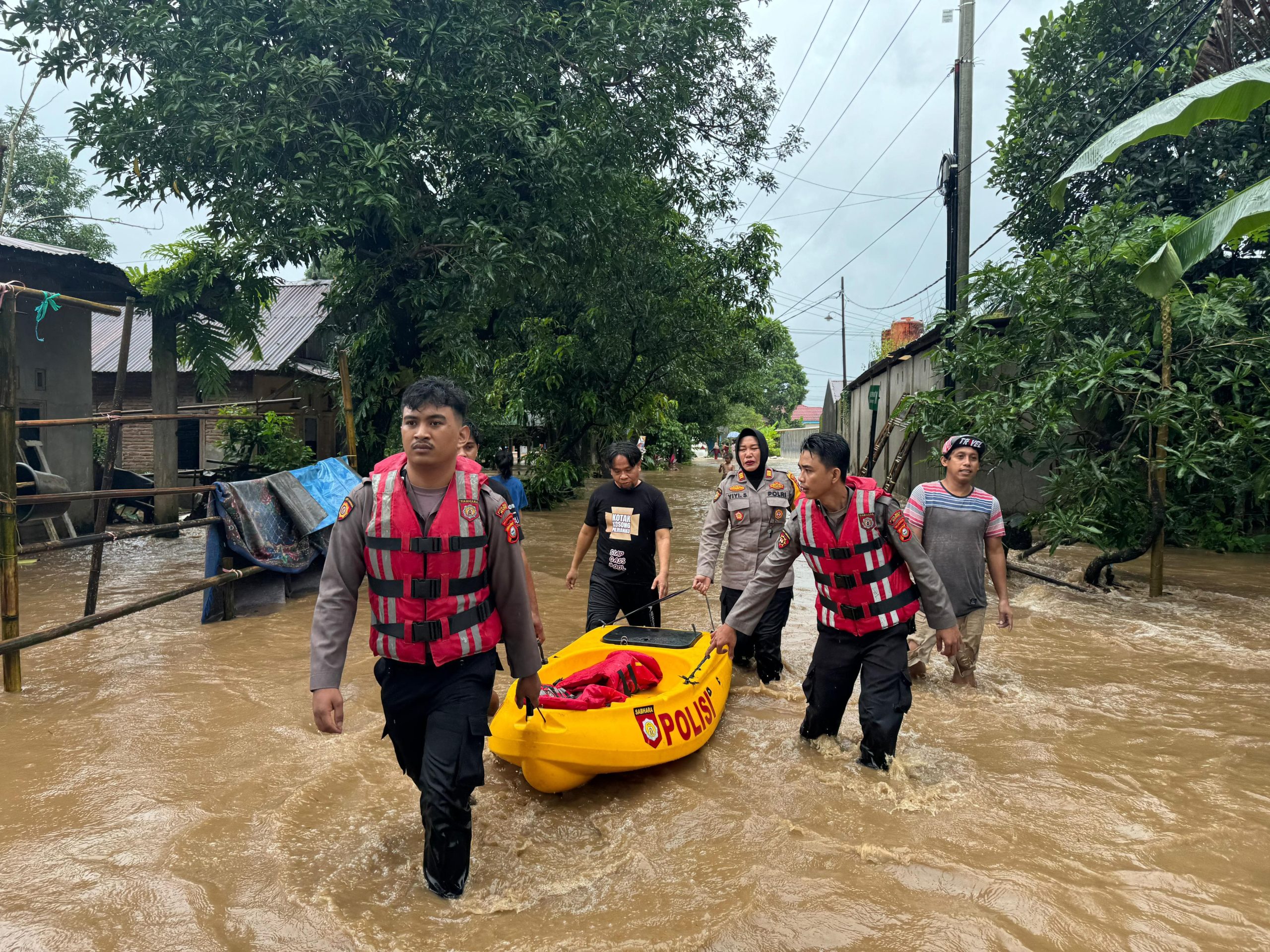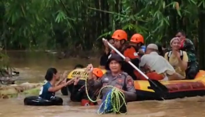 Tim SAR dari kepolisian diterjunkan ke lokasi banjir untuk membantu mengevakuasi warga, termasuk anak-anak, orang tua, dan penyandang disabilitas.