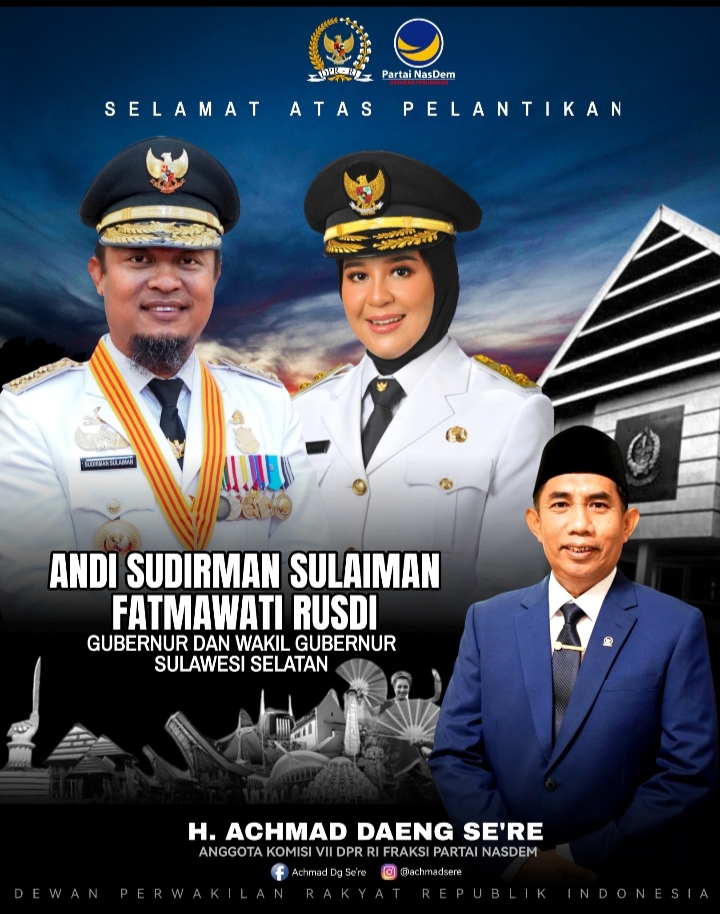 JAKARTA – Anggota DPR RI Komisi VII dari Fraksi NasDem, H. Achmad Daeng Se’re, S.Sos., M.M., menyampaikan ucapan selamat atas pelantikan Andi Sudirman Sulaiman sebagai Gubernur Sulawesi Selatan dan Fatmawati Rusdi sebagai Wakil Gubernur Sulawesi Selatan periode 2025-2030. Pelantikan tersebut menandai awal kepemimpinan baru yang diharapkan dapat membawa kemajuan bagi provinsi Sulawesi Selatan.Kamis, 20/02/2025