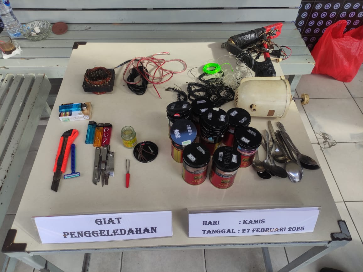 Hasil penggeledahan mendapati sejumlah barang yang berpotensi mengganggu keamanan, di antaranya kipas angin rusak, potongan kabel, sendok besi, cutter, korek gas, jepit kuku, pinset, paku, botol beling, potongan besi kotak, tali senar, dan beberapa kaleng. Meski demikian, petugas tidak menemukan handphone, narkoba, atau obat-obatan terlarang lainnya.