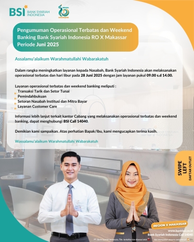 “Untuk nasabah BSI, kami siap melayani mulai pukul 09.00 hingga 14.00 WITA setiap Sabtu,” ujar Nuryadin, Branch Manager BSI KCP Takalar.