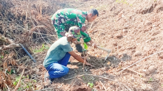 Serka Suryanto, Babinsa Desa Mangunreja, melaksanakan kegiatan Bin Tahwil berupa pendampingan penanaman pohon bersama masyarakat di Kampung Cibaga RT 01/RW 06, Kecamatan Pulo Ampel, Kabupaten Serang.