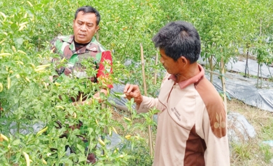 Serka Agus Joko, Babinsa Koramil 2305/Cinangka, melaksanakan pendampingan perawatan tanaman cabai milik petani di Desa Pasauran.
