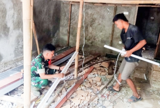 “Dengan penuh semangat, Sertu Eman turut membantu mulai dari pembongkaran hingga proses perbaikan bagian atap dan dinding rumah,” tuturnya.