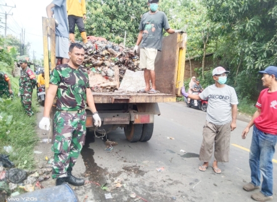 Serda Ayip Faiz Soleh, Babinsa Desa Sindangmandi, yang bersama warga setempat melaksanakan aksi bersih-bersih sampah di sepanjang jalan protokol wilayah Kecamatan Anyar.
