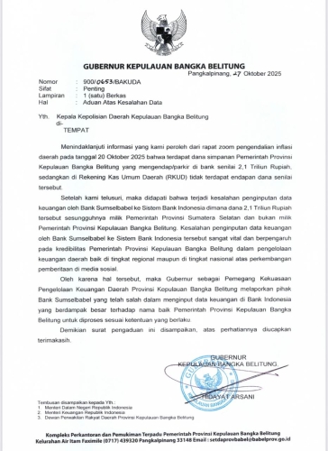 Pangkalpinang, Sekilas Indonesia – Gubernur Provinsi Kepulauan Bangka Belitung (Babel), Hidayat Arsani melaporkan pihak Bank Sumsel Babel ke Polda Babel atas kesalahan dalam menginput data keuangan di Bank Indonesia.  Surat laporan tersebut dilayangkan Pemprov Babel tertanggal 27 Oktober 2025.