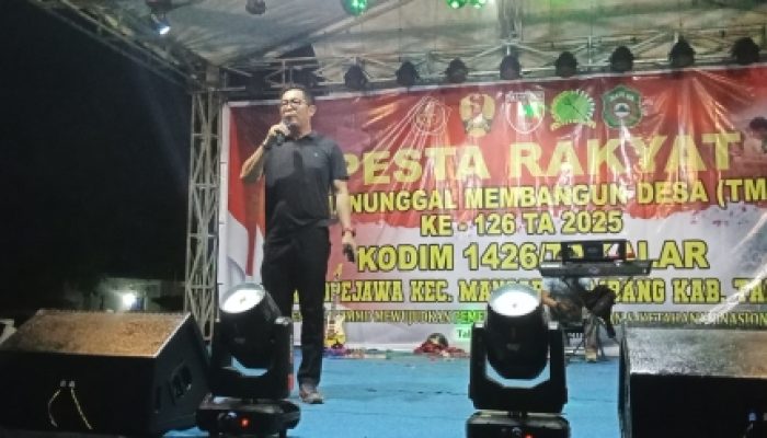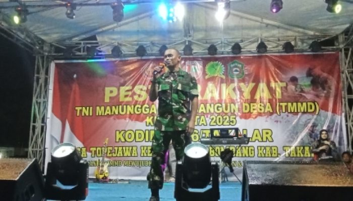 TAKALAR — Ribuan warga memadati Lapangan Sepak Bola Desa Topejawa, Kecamatan Mangarabombang, Kabupaten Takalar, pada Selasa malam (4/11/2025), untuk menghadiri Pesta Rakyat TMMD ke-126 Tahun Anggaran 2025 yang mengusung tema “TNI Selalu di Hati Rakyat.” Acara penutupan ini berlangsung meriah dan penuh keakraban, mencerminkan eratnya hubungan antara TNI dan masyarakat.
