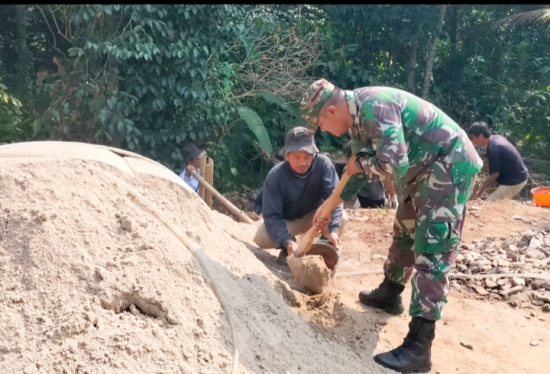 Pada bidang Karbak, Serka Amud, Babinsa Desa Margagiri, turut membantu warga dalam pembangunan pondasi rumah di Kampung Solor RT 02/03.