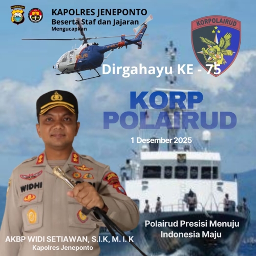Jeneponto, Sekilas Indonesia – Polisi Perairan dan Udara (Korpolairud) Polri merayakan hari ulang tahunnya yang ke-75 pada Senin, 1 Desember 2025. Momentum bersejarah ini dirayakan dengan penuh khidmat, salah satunya melalui ucapan selamat dan apresiasi dari Kapolres Jeneponto, AKBP Widi Setiawan, S.I.K., M.I.K.