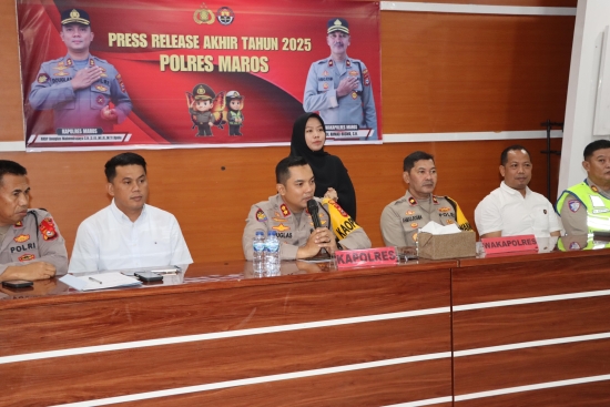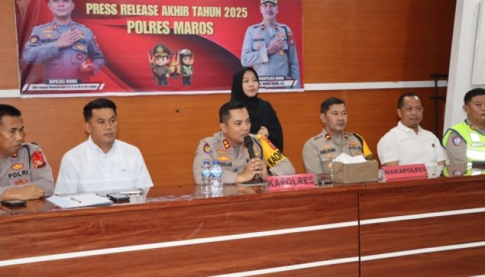 Sekilas Indonesia, Maros – Polres Maros melaksanakan konferensi pers akhir tahun 2025 sebagai bentuk transparansi dan akuntabilitas kepada publik atas kinerja kepolisian selama satu tahun terakhir. Kegiatan tersebut dilaksanakan di Aula Promoter Polres Maros, Selasa (30/12/2025), dan dipimpin langsung oleh Kapolres Maros AKBP Douglas Mahendrajaya, S.H., S.I.K., M.I.K., M.Tr.Opsla yang didampingi Wakapolres Maros Kompol Ahmad Rosma, S.H., bersama para Pejabat Utama (PJU) Polres Maros.