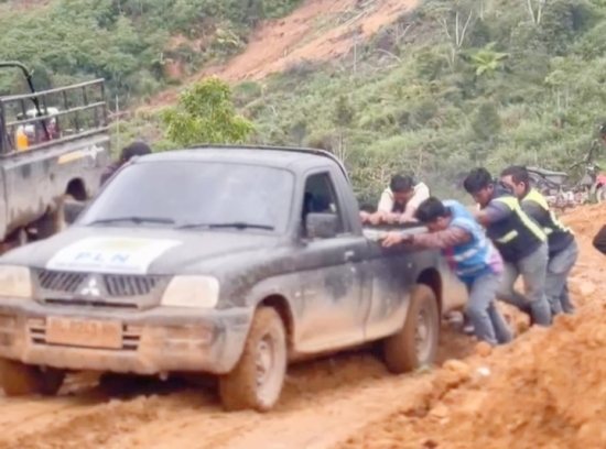 Medan yang berat juga menyulitkan kendaraan operasional PLN untuk menjangkau daerah-daerah yang masih terisolasi.
