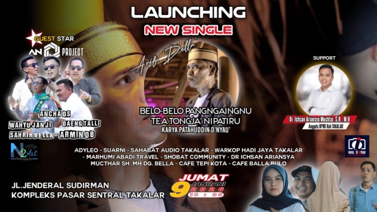 Peluncuran lagu daerah karya anak Takalar tersebut dijadwalkan berlangsung di pelataran kios Pasar Sentral Takalar pada Jumat, 9 Januari 2026, mulai pukul 18.30 WITA hingga selesai. Kegiatan ini akan menghadirkan sejumlah seniman dan artis Makassar, di antaranya Udhin Leaders, Syahrir Bella, Haris Situru, Ancha, Wahyu Janji, Daeng Talli, Armin Dg Buang, Asri Dg Rani, dan Syamsul Anchu.