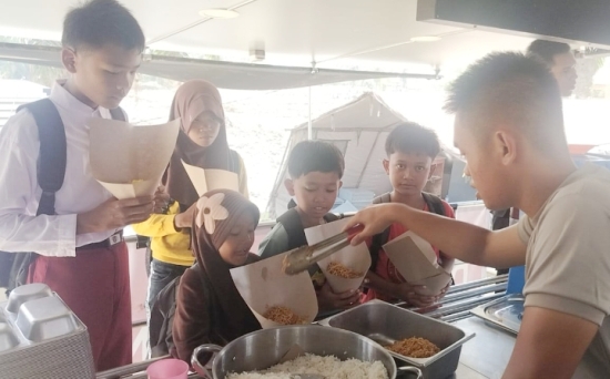 Di dapur lapangan Posko Pengungsian Samsat Aceh Tamiang, suasana humanis tampak saat seorang anggota Polri melayani lima siswa yang mengantre sambil membawa nasi dalam bungkusan terbuka. Anggota tersebut dengan sabar membagikan lauk makanan kepada para siswa yang terdampak bencana.