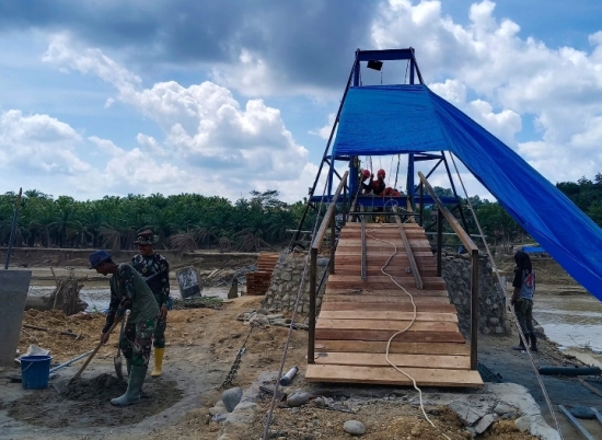 Personel TNI terus mempercepat pembangunan jembatan gantung sebagai solusi sementara agar mobilitas masyarakat kembali normal.