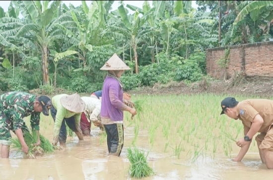 Serma Sutiknyo, Babinsa Desa Bojonegara, melaksanakan kegiatan pendampingan tanam padi bersama Petugas Penyuluh Lapangan (PPL) di Kampung Lumalang RT 01 RW 06, Kecamatan Bojonegara.