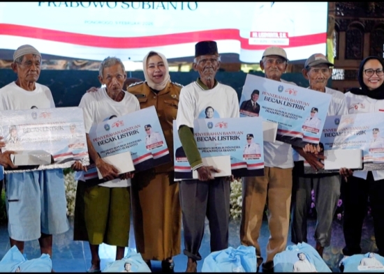 Presiden Prabowo Subianto melalui Yayasan Gerakan Solidaritas Nasional (GSN) menyalurkan 530 becak listrik untuk para pebecak di Ponorogo, Senin (9/2).