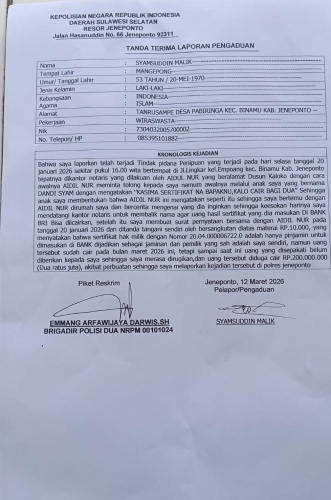 Sekilas Indonesia, Jeneponto — Seorang warga Kabupaten Jeneponto, Syamsuddin Malik, melaporkan dugaan kasus penipuan terkait peminjaman sertifikat tanah yang diduga dijadikan jaminan untuk pengajuan kredit di bank. Laporan disampaikan ke Polres Jeneponto, Sulawesi Selatan, pada Jumat (13/3/2026).
