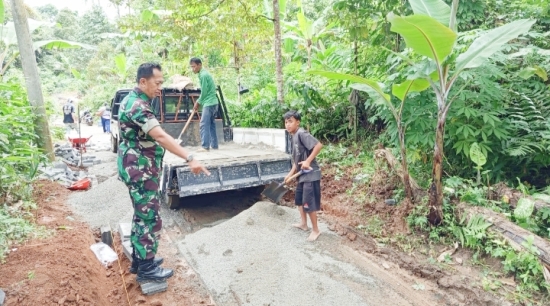Serka Jony selaku Babinsa Desa Ciwarna turut terjun langsung bersama warga melaksanakan pembersihan jalan di Kampung Kambangan, Desa Ciwarna, Kecamatan Mancak.