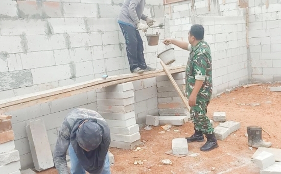 Peltu Prayitno selaku Babinsa Desa Umbul Tanjung melaksanakan kegiatan karbak dengan membantu pemasangan hebel pada rumah salah satu warga di Kecamatan Cinangka.