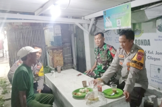 Sertu Riadi, Babinsa wilayah Jombang Wetan, melaksanakan komsos dengan aparat keamanan gabungan dalam rangka pengawasan dan pengamanan di pos kamling warga Link Kubang Laban, Kelurahan Jombang Wetan, Kecamatan Jombang, Kota Cilegon.