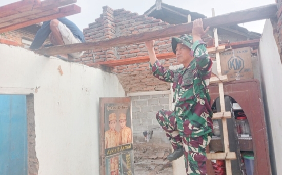 Serma Agus H, Babinsa Kelurahan Gerem, turun langsung bersama warga melaksanakan kegiatan Karbak dalam rangka membantu perbaikan rumah salah satu warga di lingkungan Gerem Kagungan, Kelurahan Gerem, Kecamatan Grogol, Kota Cilegon.