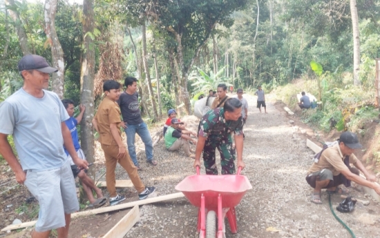 Serka Fadilah selaku Babinsa Desa Balekambang melaksanakan kegiatan Karbak bersama warga dengan melakukan pengecoran jalan di Kampung Blokang, Desa Balekambang, Kecamatan Mancak.