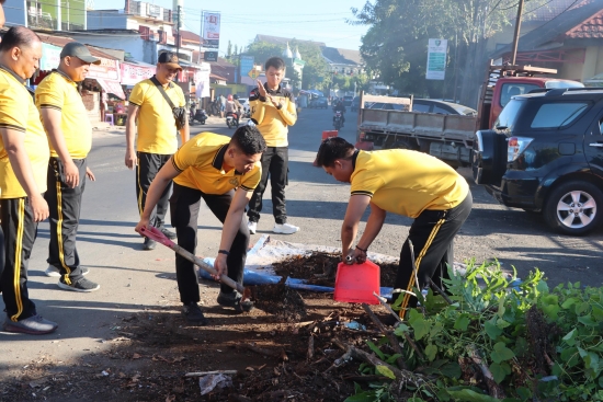 Personel tampak kompak membersihkan halaman, merapikan taman, serta mengumpulkan sampah di area sekitar mako guna menciptakan lingkungan yang bersih dan nyaman.