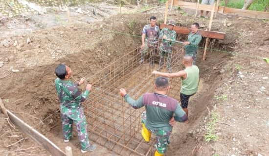 Sejumlah personel terlihat mengeruk tanah di sisi sungai menggunakan ekskavator sebagai titik fondasi utama jembatan. Selanjutnya, mereka pun dibantu warga untuk memasang kerangka besi dan mengecor dengan semen agar struktur lebih kokoh.
