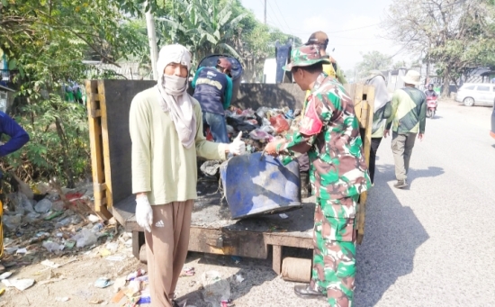 Pelda Asep, Babinsa Desa Wanakarta, melaksanakan kegiatan Karbak dengan membantu pembersihan sampah di Kampung Kianar, RT 01/RW 02, Kecamatan Bojonegara.